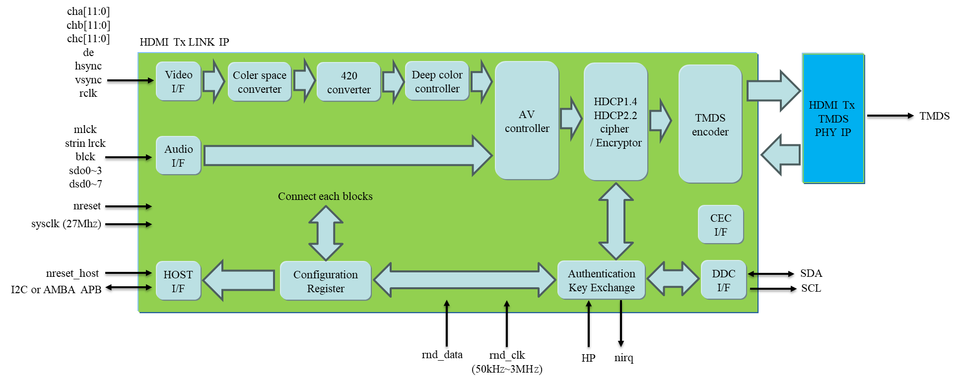 Silicon Library (SLI) HDMI 2.0 TX IP solution, which consists of analog PHY IP and digital LINK IP, is compliant with HDMI 2.0b standard. PHY IP is provided as a hard macro while LINK IP is provided as a soft macro including synthesizable RTL code. SLI HDMI 2.0 TX PHY IP consists of three data channels, one clock channel and a clock multiplier PLL, and it supports the data rate up to 6Gbps per channel. LINK IP includes HDCP compliant with 2.2 / 1.4. The combination of SLI’s PHY IP and LINK IP ensures that customers easily and securely implement HDMI interface to SoCs.